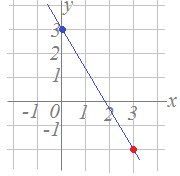 例11右のような直線の方程式を読み取りたいとき, ○ 青の点のy座標から切片は3です. ○ 次に,傾きを求めるときに,xが1だけ増加したときのyの増加を読み取ろうとすると,分数(小数)になってしまって正確に読み取れません. そこで,右に進んでx座標,y座標の両方とも整数であるような点を探すと,赤で示した点まで右に3,上に−5(下に5)進めばよいことが分かります. 傾きは−になります. ○ これらを組み合わせると,直線の方程式が求まります. 直線の方程式 : y=−x+3 |