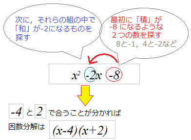 (1) 最初に「積」が−8となる2数の組合せを考えます. 「積」は定数項(xの付いていない項)から考えることが重要!