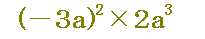 \( \displaystyle (-3a)^2\times 2a^3=9a^2\times 2a^3=18a^{2+ 3}=18a^5 \)