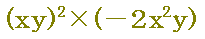 \( \displaystyle (xy)^2\times (-2x^2y)=x^2y^2\times (-2x^2y)=-2x^{2+ 2}y^{2+ 1} \)