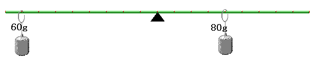 だから,左に回す力が大きくなって,「左が下がる」ことになります.右に回す力:80×2=160 ※左右に回す力が等しくなるときは,「つり合います」 |