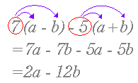 (2a−3b)−(4a−6b)=2a−3b−4a+6b 同類項を集める =2a−4a−3b+6b 同類項の係数を簡単にする =−2a+3b…(答) |
