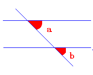 | 2直線に別の直線が交わっている右図(2)のような場合に,∠aと∠bのような位置にある角を同位角といいます.
