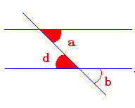 右図(3)のように平行線に他の直線が交わってできる錯角∠aと∠dについては, まず∠aと∠bが同位角で等しく 次に∠bと∠dが対頂角で等しいので,∠a=∠dとなります. |