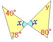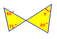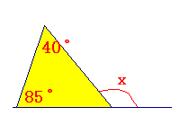 「三角形の内角の和は180°」という性質を使えば,∠xの内角=180°−(40°+85°)=55°