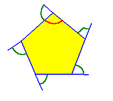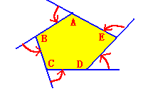 【解説1】 多角形の外角の和とは,各頂点の外角(1つずつ)の和です. 次の図のように,各頂点で外角だけ回転すると,合計で1回転します. だから,三角形,四角形,五角形,....のどの形でも外角の和はつねに360゚になります.