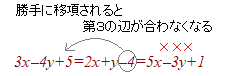 x−5y−4=3x−y …(2) それぞれ右辺にあるx, yの項を左辺に移項し,左辺にある定数項を右辺に移項して整理すると (1)→