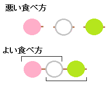 2x+y−4=5x−3y+1 〇ここで誰もが間違いやすいことについて注意します.次の悪い食べ方で示したように,団子1つずつに切り離してしまうと「方程式のイコールがなくなって」しまいます.そうではなくて,下の図に示したように,2つずつに切り分けるのです.このとき真ん中の団子は2回登場します.(「A=BかつB=C」だからです.) ![]()