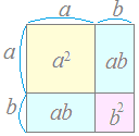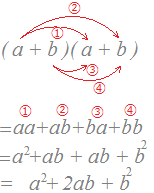 の和になるが,そのうち2つの長方形は掛け算の順序が違うだけで同じものなので長方形2個 に等しいということを示しています. (2)についても図形的な解釈をやろうと思えばできますが,3乗,4乗・・・の展開もいずれ登場することを考えると,いつまでも簡単な図形で示せるとは限りません.ここでは文字式としての「計算方法」だけは身に付けるようにします・・・文字式の変形規則は,少々複雑になっても混乱しないようにうまくできているので,基本の部分をしっかり身に付けるようにしましょう. (2)の公式も次のように示すことができます. |