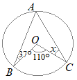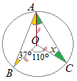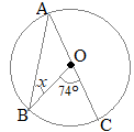 (3)右の図のように,円Oの円周上に3つの点A, B, Cがあり,∠BOC=74°であるとき,∠xの大きさを答えなさい。 (新潟県2015年入試問題)