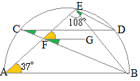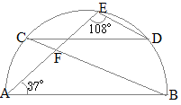 (4)右の図は,線分ABを直径とする半円で,2点C, Dは ∠BAE=37°, ∠AED=108°のとき,∠BFEの大きさを求めなさい。 (熊本県2015年入試問題)