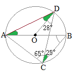 (解答)∠ACBは直径ABに対応する円周角だから90°. したがって, ∠BCD=25° 円周角は等しいから ∠BAD=25° 二等辺三角形の2つの底角は等しいから ∠ADO=25° 求める角度∠ABCは,円周角∠ADCに等しいから ∠ABC=25°+28°=53°…(答) |