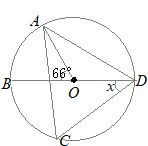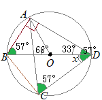 (6)右の図のように,円Oの円周上に4点A, B, C, Dがあり,線分BDは円Oの直径です。 AC=AD, ∠AOB=66°のとき,∠BDCの大きさxを求めなさい。 (埼玉県2015年入試問題)