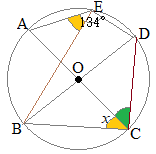 (2)右の図のように,円周上に4点A, B, C, Dがあるとき,x=°である。 (岡山県2015年入試問題)