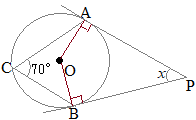∠AOBは∠ACBに対する中心角だから∠AOB=140° OA⊥AP, OB⊥BPであり,四角形の内角の和が360°になることから 140°+90°+90°+∠x=360° ∠x=40°…(答) |