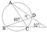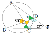 対頂角は等しいから∠DEC=80° 円周角は等しいから ∠ECB=∠x このxを用いて,四角形DECFの内角の和を求めると 80°+180°−∠x+180°−∠x+32°=360° 2∠x=112° ∠x=56°…(答) |
