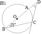 (3)図1のような円Oにおいて,線分ABは円Oの直径である。円Oの周上の点Cを通る接線と直線ABとの交点をDとする。∠ABC=25°のとき,∠BDCの大きさを求めよ。 (長崎県2017年入試問題)