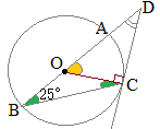 半径OCは接線CDと垂直∠OCD=90° △OBCは二等辺三角形だから ∠BCO=25° △OBCの2つの内角の和は,1つの外角に等しいから ∠AOC=25°+25°=50° △OCDの内角の和は180°だから ∠BDC=40°…(答) |