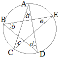 (1)右の図で,∠a+∠b+∠c+∠d+∠eの大きさを求めなさい。 |