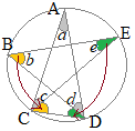 (1) 一つの弧に対する円周角は等しい.(2) 三角形の内角の和は180°になる. |