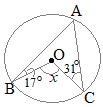 右図において,緑で示した2つの角は,二等辺三角形の底角だから等しい∠OAC=31° 黄色で示した2つの角も,二等辺三角形の底角だから等しい ∠OAB=17° 円周角は中心角の半分(中心角は円周角の2倍)だから ∠x=2×(31°+17°)=96°…(答) |