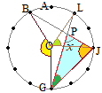 ∠x自体は円周角ではないので,直接は求められませんが,三角形の残りの角が円周角として求まると,∠xを間接的に求めることができます.例えば,右図の1つの三角形△PGJにおいて,円周角∠LGJに対応する中心角∠LOJ=60°だから ∠LGJ=30° また,円周角∠BJGに対応する中心角∠BOG=150°だから ∠BJG=75° 次に,三角形△PGJの内角の和は180°だから ∠x+30°+75°=180° したがって ∠x=75°…(答) |