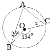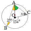 (2)右の図において,3点A, B, Cは円Oの周上の点である。∠ABO=25°, ∠BOC=134°のとき,∠xの大きさを求めなさい。 (秋田県2017年入試問題)