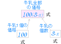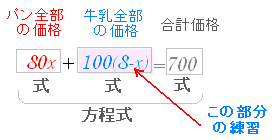 【はじめに】 x の方程式では,左辺と右辺が等しくなるような x の値を求めます. 例 1個 80 円のパンと1個 100 円の牛乳を合計 8個買うと合計 700 円になった.パンを何個買ったか求めたいとき,パンを x 個買ったとすると,