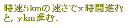 ![]() (距離)は(速さ)×(時間)で求めることができます. 時速5(km)でx(時間)進んだ距離は5x(m)だから,y=5x→閉じる←