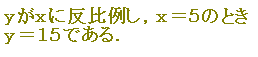 ![]() yがxに反比例するのだから 次に,x=5のときy=15だから,この値を代入してaを求めることができます. から,a=75 したがって,