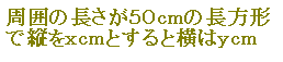 ![]() 長方形には縦xが2本と横yが2本あり,周囲の長さは2x+2yになります. 2x+2y=50よりx+y=25すなわち |