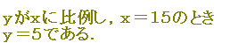 ![]() yがxに比例するのだからy=axとおけます. 次に,x=15のときy=5だから,この値を代入してaを求めることができます. 5=15a から, 元の関係式は |