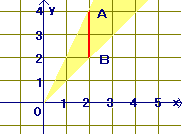原点を通る直線y=axが線分AB(両端を含む)と交わるとき(1) 傾きが最も小さくなるのは図のOBとなる場合で,そのときの傾きは (2) 傾きが最も大きくなるのは図のOAとなる場合で,そのときの傾きは したがって,1≦a≦2 ※何か便利な公式があるのかと考えてはいけない.教科書に出ていないような公式は勝手に使えない.この問題では,図を見て「傾きが小さいとき」「傾きが大きいとき」を目で見て考えて,階段の絵を描いて,縦÷横で傾きを計算する. |