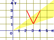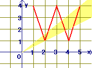図の黄色で示した範囲でV字形の折れ線と2回交わり,それよりも傾きが小さいと全く交わらず,黄色の範囲よりも少し大きいと1回だけ交わる.(ただし,V字の下端では1回だけ交わる) (1) 最も小さくなるときの傾きは で,ちょうどこの値では1回しか交わらないから,この値よりも大きい. (2) 最も大きくなるときの傾きは ちょうどこの値になるときも2回交わる. したがって, |