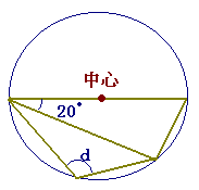 円に内接する四角形で,70°と向かい合う内角が求める∠dだから∠d+70°=180° → ∠d=110°