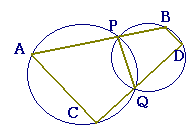2円が2点P,Qで交わるとき,P,Qを通る直線が2円と交わる点を各々A,B及びC,Dとするとき,次のうち正しいものはどれか.