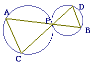 2つの円が点Pで外接しているとき,Pを通る2直線が円と交わる点を各々A,B及びC,Dとすると,次のうち正しいものはどれか.