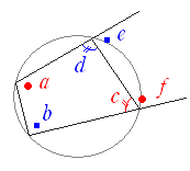 これを使えば,右図のような図形において赤で示した角について 向かい合う内角の和は 180°だから a+c=180° 直線だから c+f=180° ゆえに a=f が成り立ちます. 青で示した角について 向かい合う内角の和は180°だから b+d=180° 直線だから d+e=180° ゆえに b=e が成り立ちます. |