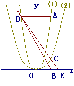 3右の図において,曲線(1)は関数y=x2のグラフであり,曲線(2)は関数y=ax2のグラフである. 点Aは曲線(1)上にあり,そのx座標は3である.点Bはx軸上にあり,線分ABはy軸に平行で,点Cは曲線(2)と線分ABとの交点である. また,点Dは曲線(1)上にあり,線分ADはx軸に平行である.直線CDの傾きは−1であり,点Eは直線CDとx軸との交点である. 原点をOとするとき,次の問いに答えなさい. (ア) 曲線y=ax2のaの値を求めなさい. (イ) 三角形ACDと三角形BDEの面積の比を最も簡単な整数の比で表わしなさい.