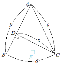 △ABC はAB=AC の二等辺三角形だから,A からBC に垂線BE をひくとAE⊥BC,BE=EC=3 になる.さらに相似図形の性質を使えば,次の図 DC の長さも求められる. ![]() 直角三角形ABE に三平方の定理を適用すると