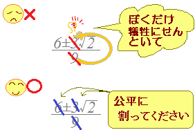 分ければ簡単になるものは分けて答える. 根号の中に数字が残るもの ⇒ 分けても簡単にならない. 分けても簡単にならないものは±のまま答える. |