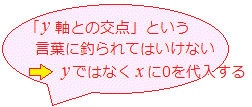 y軸を表す直線の方程式はx=0です.⇒ y軸との交点の座標を求めるためには,x=0を代入してy座標を求めます. 【例】 直線3x+4y=24とy軸との交点を求めるには, x=0を代入→4y=24→y=6だから交点の座標は(0, 6) ![]()