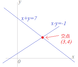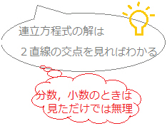 連立方程式(1)(2)の解は,2つの方程式(1)(2)を両方とも満たすものですが,これはグラフで考えれば両方の直線上にある点ということになります. したがって,連立方程式の解は2直線の交点の座標になります. ![]() ![]() |