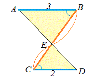 が成り立つ.△AEBと△DECについて ∠AEB=∠DEC …(対頂角は等しい) ∠ABE=∠DCE …(平行線の錯角は等しい) だから,△AEBと△DEC は相似図形 そこで BE:CE を求めたいときは,AB:DC の比3:2 を書けばよい.(♪〜「辺の比は相似比で答える」〜♪)