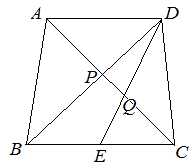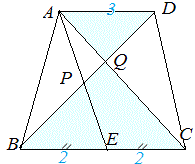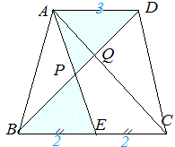 ![]() --図2-- 図2において AD//BC ,AD=3 ,BC=4 ,E は BC の中点,対角線 BD と AE ,AC の交点を各々 P ,Q とするとき,(1) BP:PD は△APD と△EPB を見れば分かるから,2:3 (2) BQ:QD は△AQD と△CQB を見れば分かるから,4:3(3) BP:PQ は(1)(2)から次のように計算で求められる.