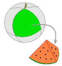 ※ 球の表面積Sは円の面積πr2の4倍になる.(非常にきれいな関係) ※ 高校数学IIIで微分を習えば,体積 [問題2] (1) 半径 5 の球の表面積を求めなさい. (2) 半径 3 の球の表面積を求めなさい. (3) 球Aの半径が球Bの半径の2倍であるとき,次の空欄を埋めなさい. (4) 半径 6(cm) のスイカを右図のように縦に6等分して6人に分けるとき,1人分のスイカの表面積を求めなさい. |