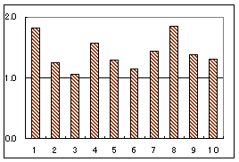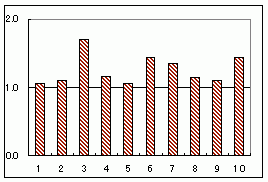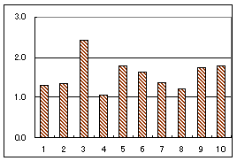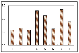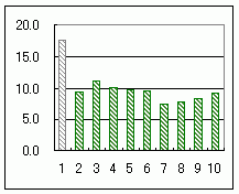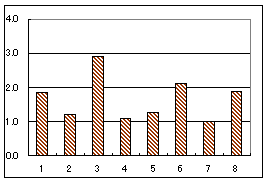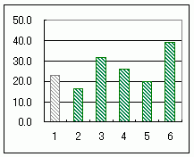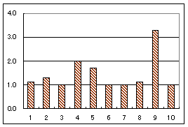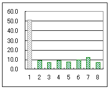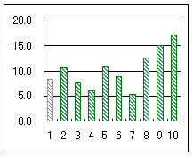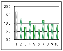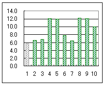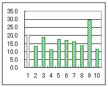 グラフ2は横軸が問題番号,縦軸は直前の操作以降その問題の採点までの所要時間(秒)を表わす.ただし,第1問は初めからの時間.