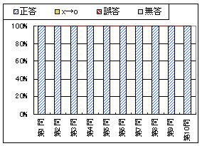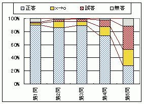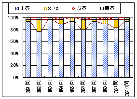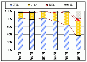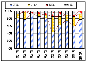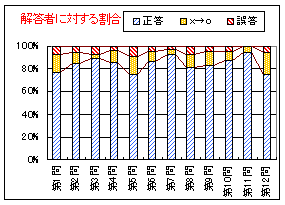 左のグラフ1は問題ごとの正答,誤答,無答の割合(正誤は最初の採点)で,黄色で示したものは初め誤答で再試行の結果正答に変った割合を表わす.