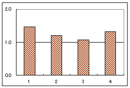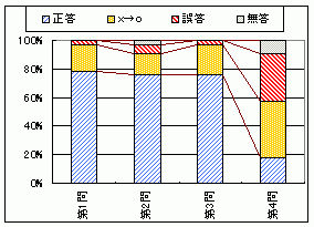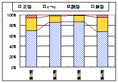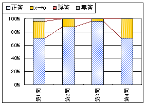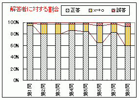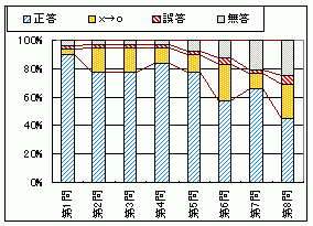 左のグラフ1は問題ごとの正答,誤答,無答の割合(正誤は最初の採点)で,黄色で示したものは初め誤答で再試行の結果正答に変った割合を表わす.この頁については無答答案が多いので,各問題の解答者に対する割合も下に示す.