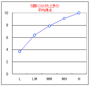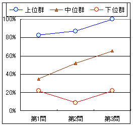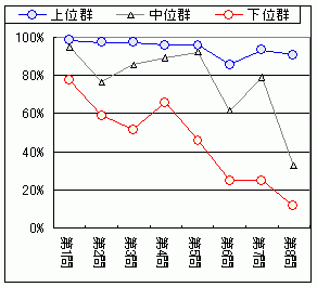 グラフ5は合計得点によって回答者全体を上位群,中位群,下位群(各33%)に分けたときの群別・問題別正答率を示す.